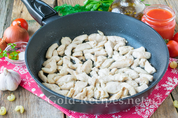 Спершу необхідно обсмажити до золотистого відтінку м’ясо птиці.