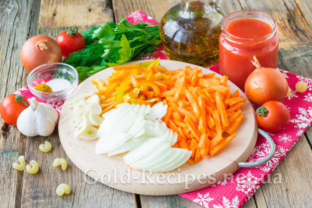 Поки смажиться м’ясо, підготуємо овочі. Ріпчасту цибулю поріжемо чверть кільцями, моркву та болгарський перець подрібнимо соломкою, зубчики часнику поріжемо тонкими слайсами.