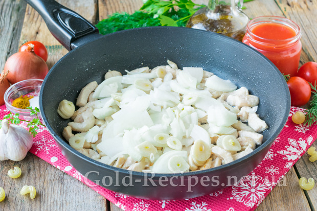 Коли куряче філе підрум’яниться, додамо до нього подрібнені цибулю та часник.
