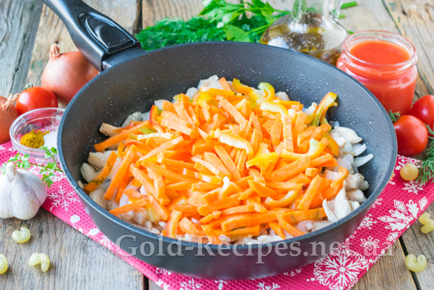 Потім додамо до курки моркву та болгарський перець. Перемішаємо і продовжимо обсмажувати інгредієнти разом до м’якості овочів.