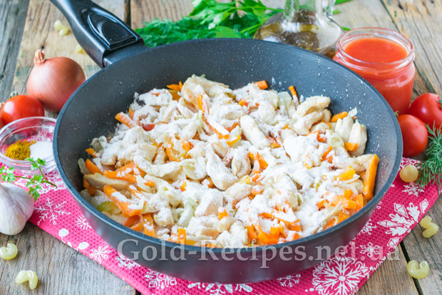 Потім необхідно додати овочі й обсмажити їх разом із куркою до м’якості.