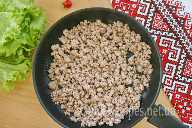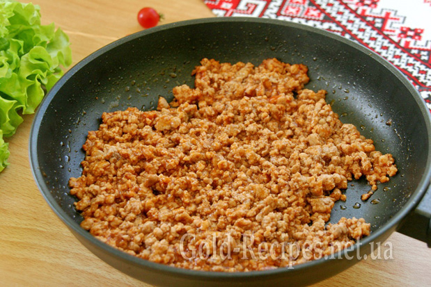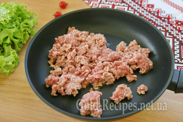 Викладаємо фарш на добре розігріту сковорідку з невеликою кількістю рослинної олії. За допомогою лопатки ділимо фарш на невеликі шматочки.