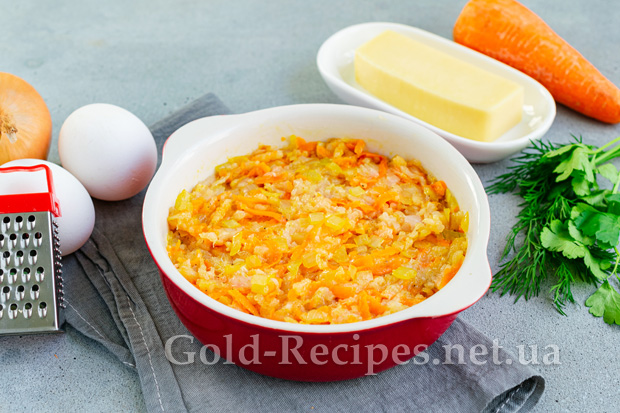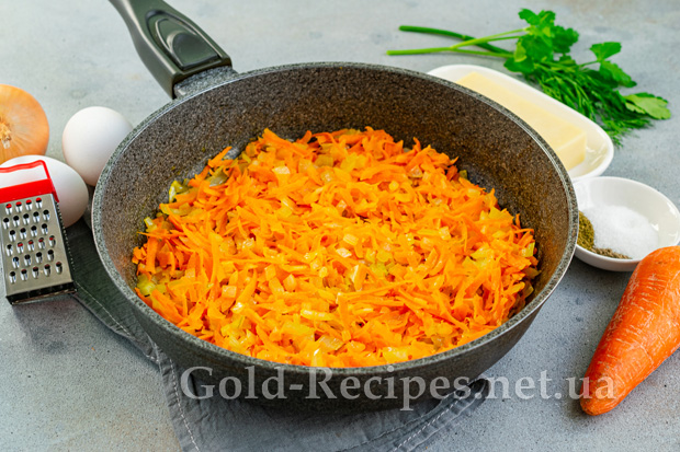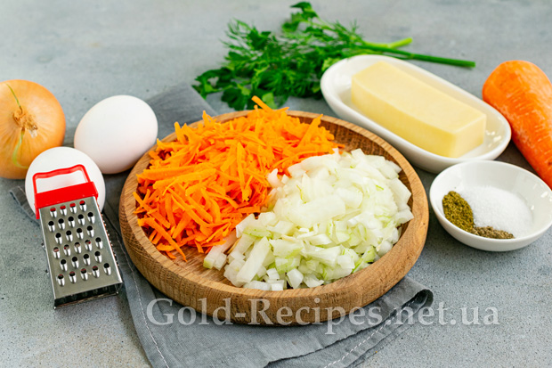 Ріпчасту цибулю очищаємо від лушпиння, нарізаємо дрібними кубиками. Моркву миємо, очищаємо від шкірки, подрібнюємо на тертці з великим полотном.