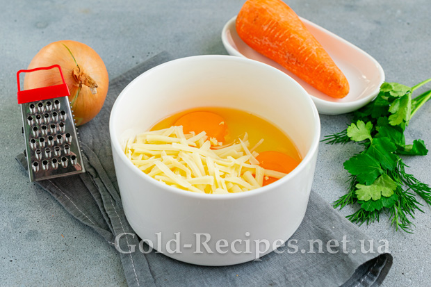В окремому посуді з’єднуємо курячі яйця і тертий твердий сир. Перемішуємо суміш до однорідної консистенції.