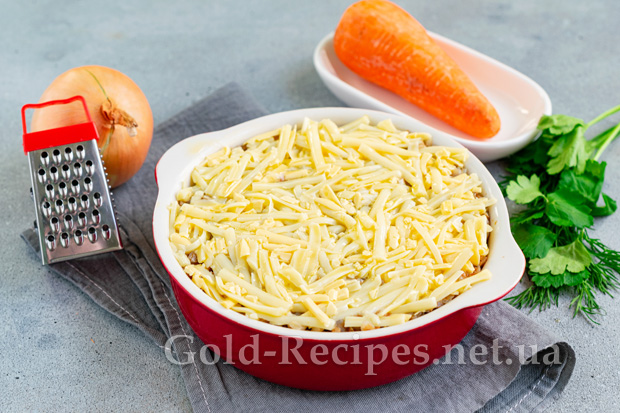 Поливаємо запіканку з гречки з фаршем сумішшю з яєць і тертого сиру.