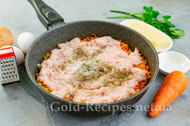 Зверху розподіляємо курячий фарш, змішаний із пасерованими овочами.