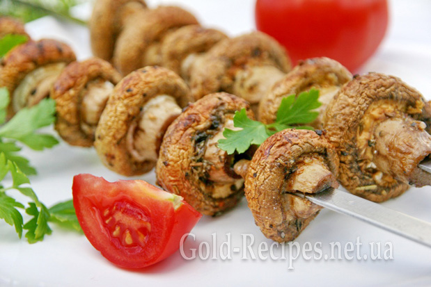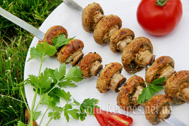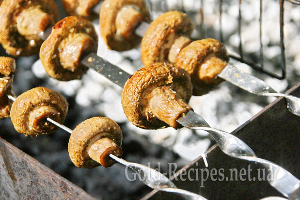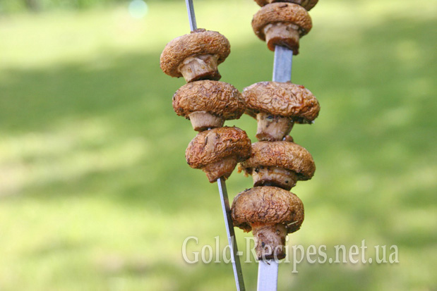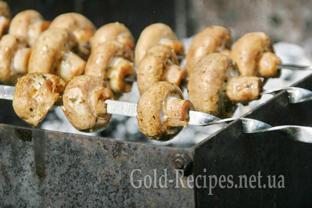 Потім промариновані шампіньони нанизуємо на шампури і починаємо смажити на мангалі. Вугілля для грибів має бути таким самим, як для шашлику.