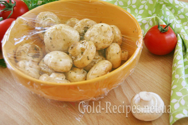 Прикриваємо миску з грибами харчовою плівкою і відставляємо години на дві, щоб маринад увібрався.