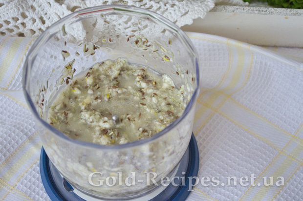 У маленьку чашу блендера наливаємо оливкову олію, кладемо часник, солі та всі спеції, і збиваємо на мінімальних обертах.