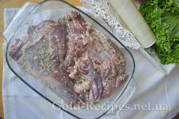 Затягуємо форму з м’ясом баранини харчовою плівкою і прибираємо в холодильник маринуватися щонайменше на шість годин, а краще на добу.