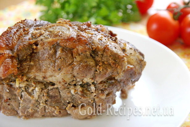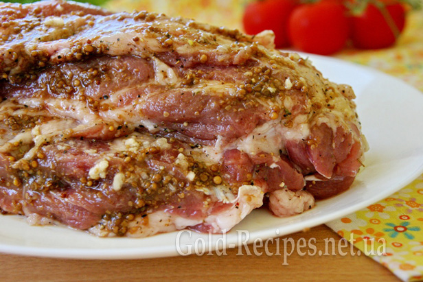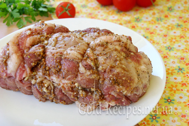 М’ясо в нас є, тепер нам треба його замаринувати. Для цього з усіх боків змащуємо його сіллю, сумішшю перців, гірчицею і часником, пропущеним через прес.