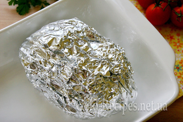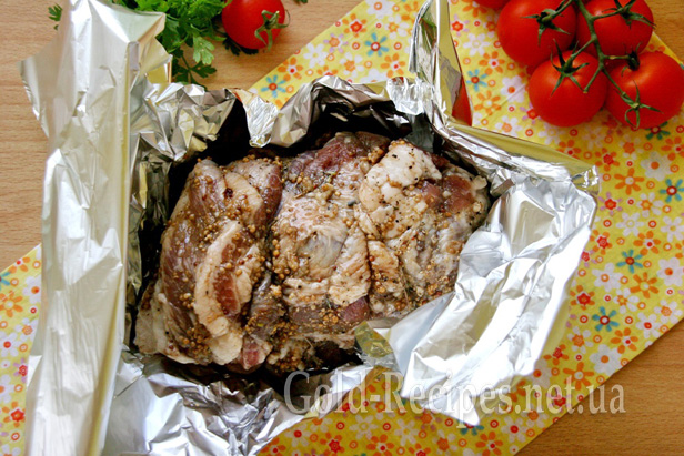 Для запікання викладаємо м’ясо на досить великий шматок фольги й акуратно її загортаємо.