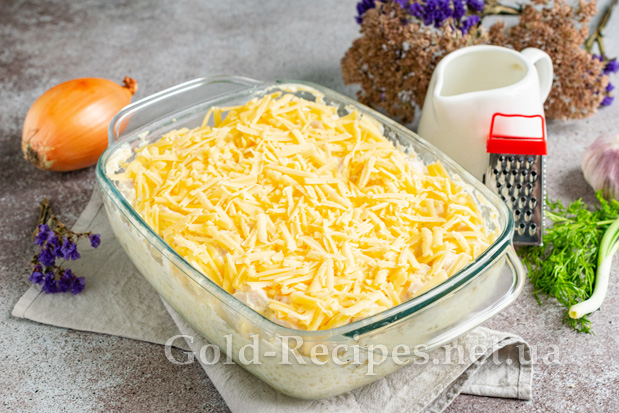 Твердий сир подрібнюємо на тертці з великим полотном. Рівномірно розподіляємо тертий сир поверх запіканки.