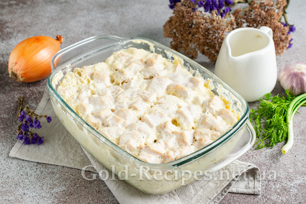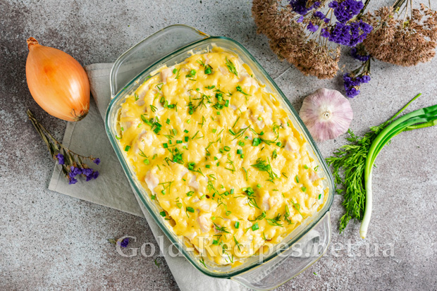 Пропоную вашій увазі ситну і дуже смачну страву – картоплею з курячим філе в духовці, запечену під вершковим соусом і апетитною скоринкою з твердого сиру.