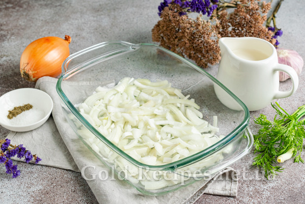 Ріпчасту цибулю очищаємо від лушпиння, нарізаємо чверть кільцями. Викладаємо овочі на дно жароміцної форми для запікання, змащеної олією.