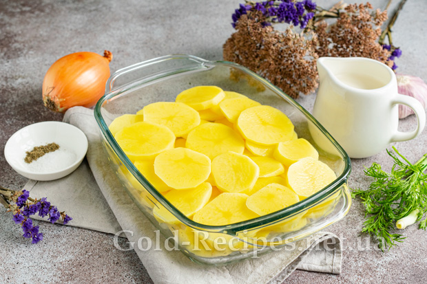 Викладаємо кружальця картоплі поверх ріпчастої цибулі.
