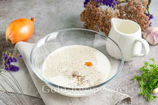 В окремому посуді змішуємо вершки, курячі яйця, сіль і чорний мелений перець.