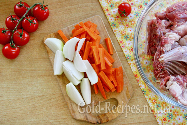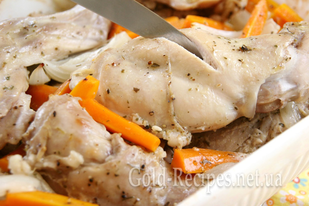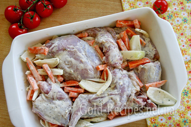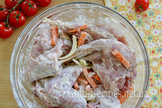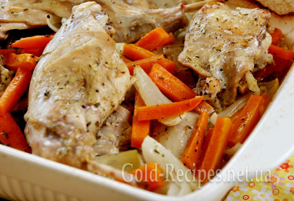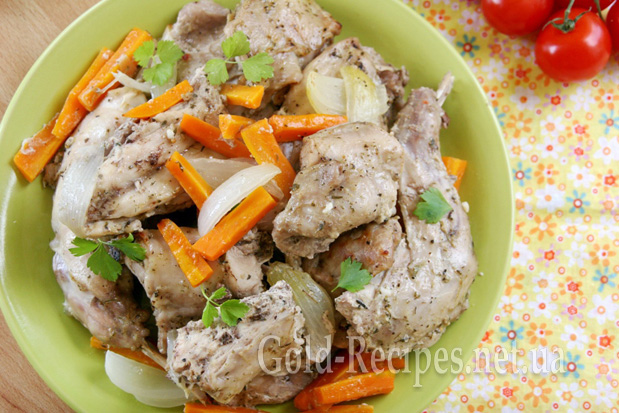 Вкриваємо форму фольгою і готуємо м’ясо кролика в духовці, розігрітій до 180 градусів, протягом 1,5 години.