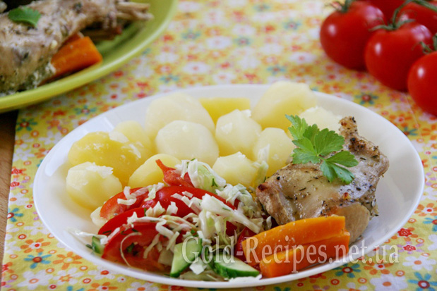 Після закінчення цього часу дістаємо кролика, знімаємо фольгу. Перевіряємо на готовність: м’ясо має на зрізі бути білим.