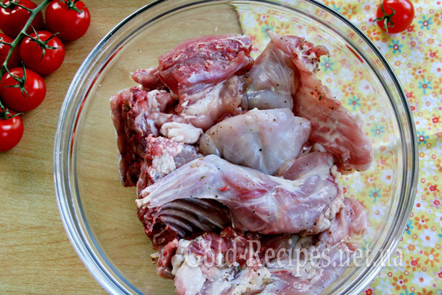 Нам треба лише вимити його і обсушити паперовим рушником. Ріжемо кролика на порційні шматки, додаємо сіль, перець і перемішуємо.