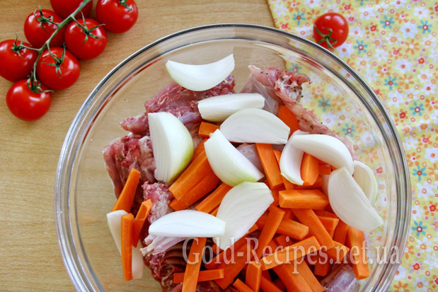 Моркву та цибулю чистимо. Нарізаємо моркву невеликими брусочками, а цибулю ріжемо на 4 частини.