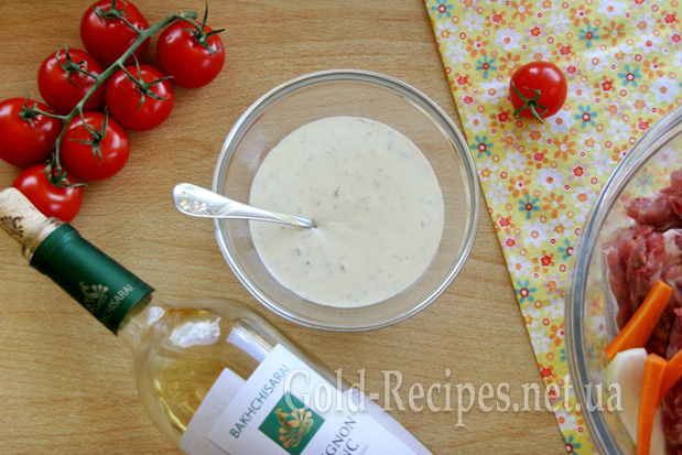 Готуємо сметанну заливку. Сметану заливаємо окропом, перемішуємо. Додаємо вино і прованські трави, знову перемішуємо.