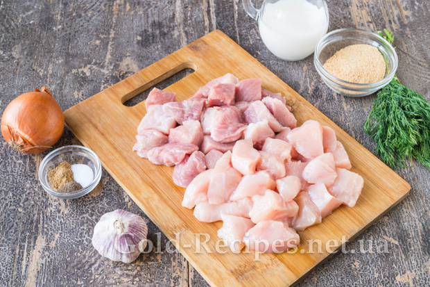 М’ясо помиємо й обсушимо серветками від зайвої води. Зачистимо курку і свинину від плівок і жиру, розріжемо філе на невеликі шматочки.