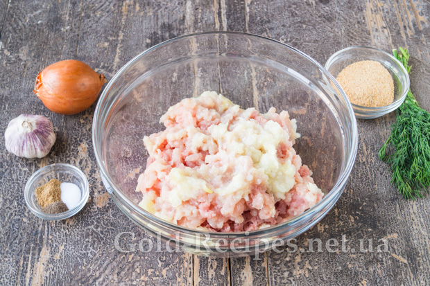 Пропустимо м’ясо через м’ясорубку з дрібною решіткою. У такий самий спосіб подрібнимо одну ріпчасту цибулину та зубчик часнику.