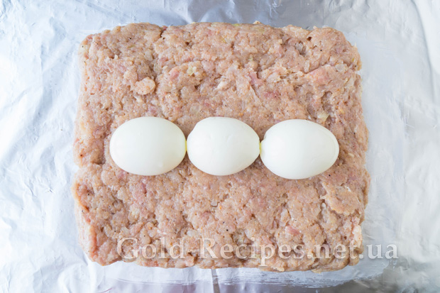 У центр викладемо готовий фарш у вигляді прямокутника і ретельно його розрівняємо. Посередині викладемо варені яйця.