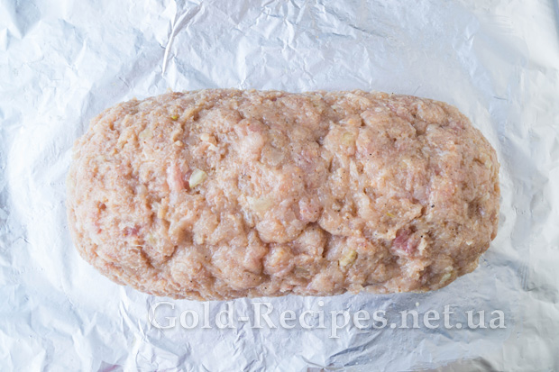 Тепер ретельно вимісимо фарш і відіб’ємо його, щоб він став густим і однорідним. Харчову фольгу складемо у два шари. Змастимо її соняшниковою олією без запаху.
