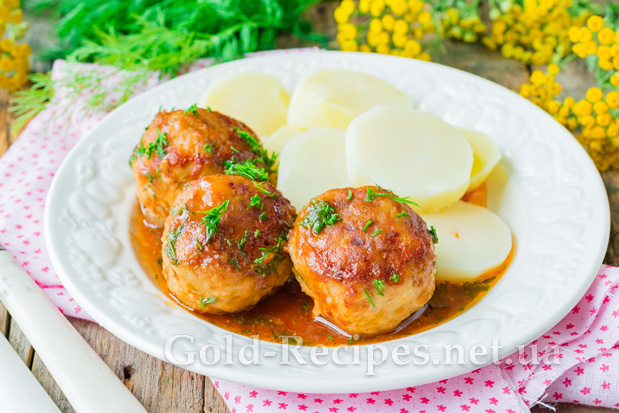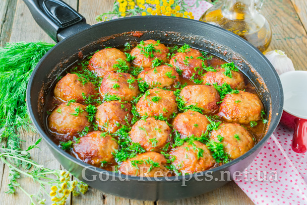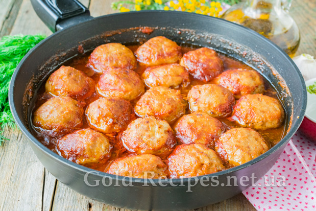 Заллємо мітболи томатним соусом. Накривши сковорідку кришкою, будемо тушкувати тефтелі в соусі протягом 25-30 хвилин. За цей час вироби повністю приготуються, а соус загусне.