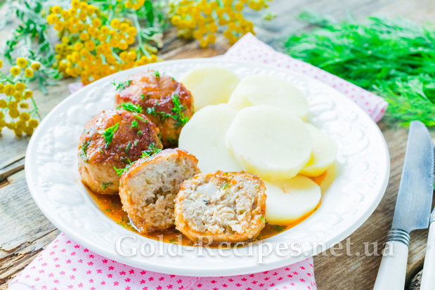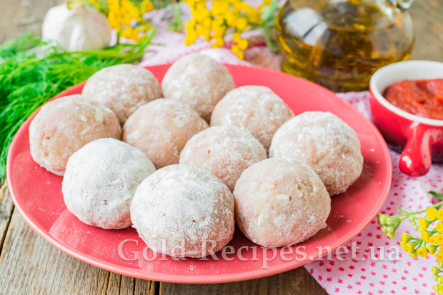 Ретельно вимісимо фарш, домагаючись однорідної консистенції. Сформуємо з готового фаршу круглі вироби розміром із волоський горіх. Запаніруємо кожен виріб у невеликій кількості пшеничного борошна.