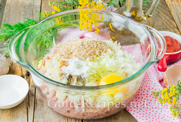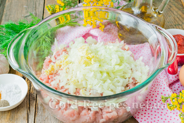 Додамо до м’ясного фаршу дрібно порізану ріпчасту цибулю та пропущені через зубчики часнику.