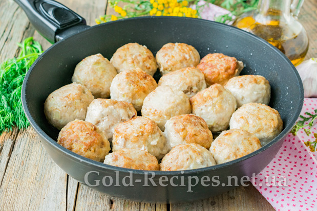 Викладемо мітболи в глибоку сковорідку з розігрітою олією. Обсмажимо вироби на середньому вогні до золотистої скоринки з усіх боків.