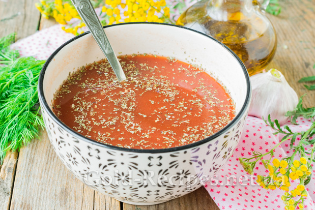 Для соусу з’єднаємо 200 мл гарячої води, томатну пасту, сіль і сушені італійські трави. Перемішаємо до однорідної консистенції.