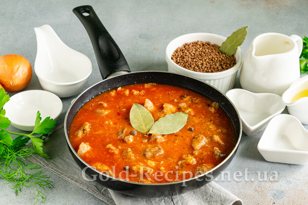 Накривши сковороду кришкою, доводимо томатну підливу з м’ясом до кипіння. Зменшуємо вогонь до мінімуму, тушкуємо підливу до готовності м’яса 20-25 хвилин.