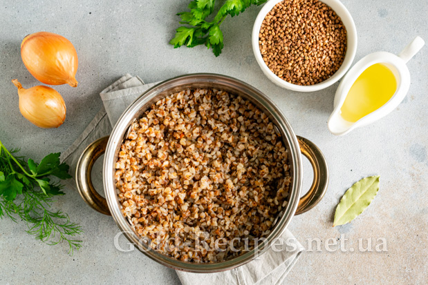 Тим часом готуємо гречану кашу. Крупу ретельно промиваємо під проточною водою. Заливаємо гречку водою у співвідношенні 1:2. Доводимо воду до кипіння, додаємо сіль за смаком. Накривши каструлю кришкою, варимо гречану крупу 15-20 хвилин на мінімальному вогні до того часу, поки вся вода повністю не вбереться. Наприкінці приготування додаємо в гречану кашу вершкове масло, перемішуємо, залишаємо кашу настоятися під кришкою 5-10 хвилин.