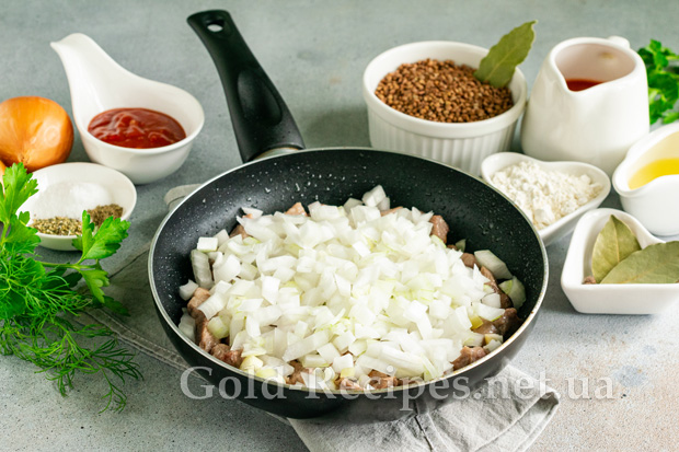 Додаємо подрібнену цибулю до м’яса. Перемішуємо, продовжуємо обсмажувати інгредієнти до готовності цибулі.
