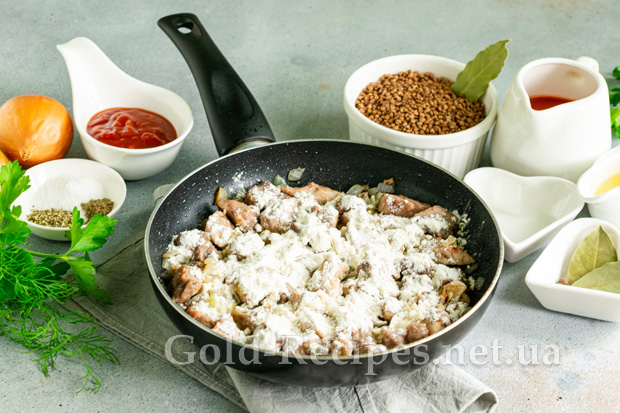 Додаємо до м’яса з цибулею просіяне пшеничне борошно. Вона допоможе загустити підливу до гречки. Перемішуємо інгредієнти, продовжуємо обсмажувати їх на середньому вогні 1-2 хвилини.