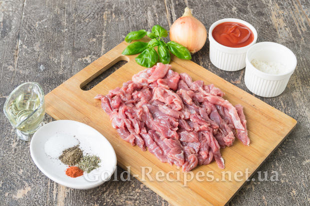 М’ясо помиємо, обсушимо серветками від зайвої води. Зачистимо телятину від плівок і поріжемо на брусочки завширшки 1-1,5 сантиметра.
