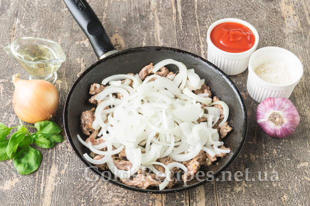 Додамо цибулю до обсмаженого м’яса.