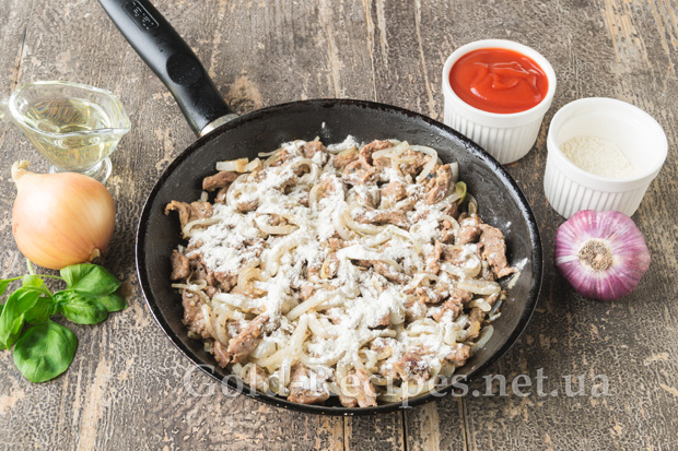 Помішуючи інгредієнти, продовжимо готувати їх на повільному вогні, щоб цибуля підсмажилася і стала м’якою. Потім додамо пшеничне борошно, щоб м’ясна підлива вийшла густою.