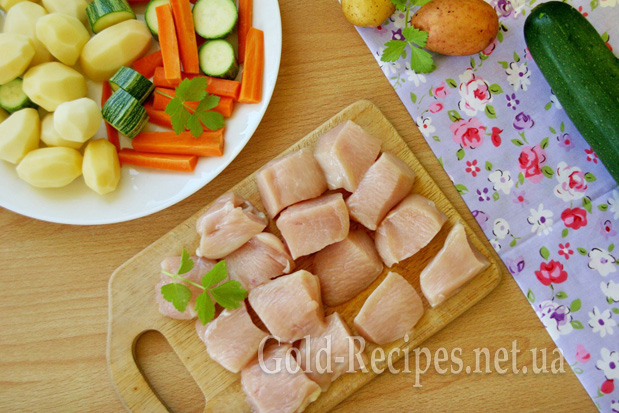 Куряче філе промиваємо холодною водою і нарізаємо кубиками приблизно 2 х 3 см.