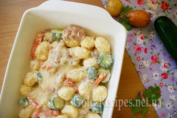 Викладаємо все у форму для запікання. Форму підбираємо широку, щоб усі інгредієнти розташувалися в один-два шари.
