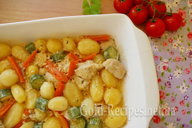Прикриваємо форму фольгою і ставимо в розігріту до 230 градусів С духовку. Запікаємо картоплю з курячим філе в духовці 40 хвилин.