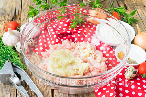 Ріпчасту цибулю очистимо від лушпиння, подрібнимо на тертці або в чаші блендера. Очищені зубчики часнику пропустимо через прес, додамо разом із цибулею до м’яса.