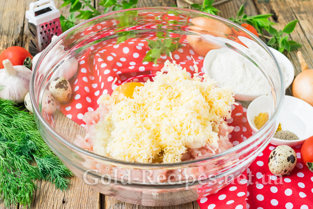 В отриману суміш додамо твердий сир, подрібнений на тертці в дрібну стружку.