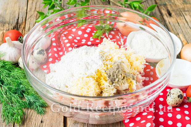 Щоб вироби добре тримали форму, додамо просіяне пшеничне борошно. Посолимо та приправимо спеціями фарш для котлеток.