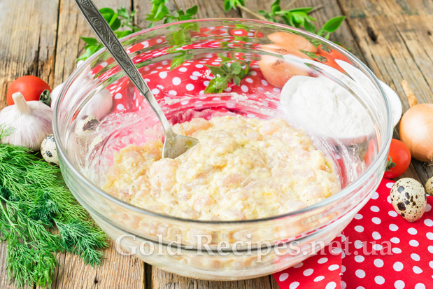 Ретельно перемішаємо суміш, домагаючись однорідної консистенції. Готовий фарш має вийти в міру рідким. За необхідності додайте ще трохи борошна.
