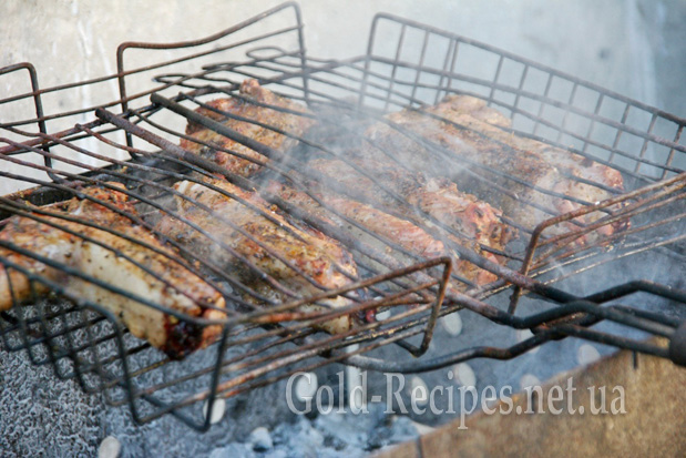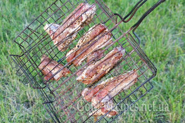 І відправляємо решітку з реберцями на мангал. Готуємо реберця на вугіллі, періодично перевертаючи решітку, щоб реберця рівномірно запікалися з двох боків.